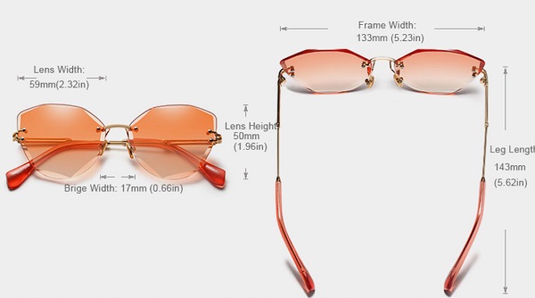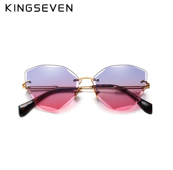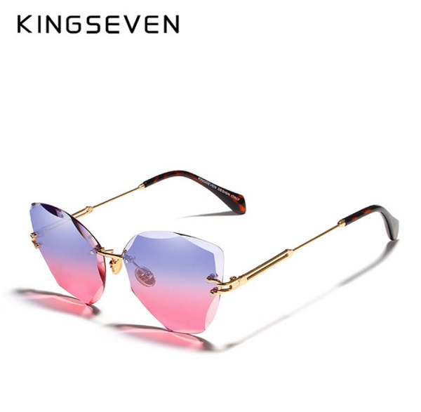 Дамски очила на марката “Kingseven” със сърцевидна форма, без рамки на стъклата, с алуминиеви дръжки. Стъклата са оцветени в розово с преливащ нюанс към лилаво или в сив цвят с градиент.
