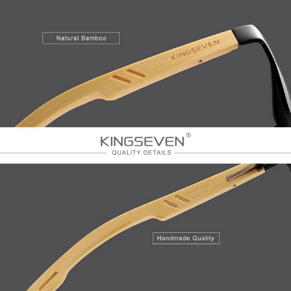 Sunglasses with elongated retro frames and polarised lenses. The sunglasses have a light aluminium frame and handmade bamboo arms.