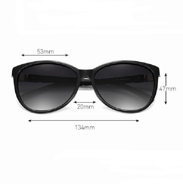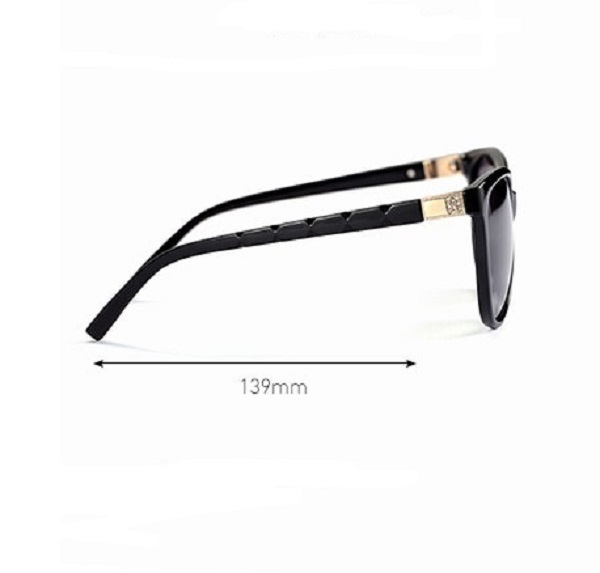 Елегантни дамски очила тип “Котешко око” с черна рамка и черни стъкла. Рамката е от пластмаса, а стъклата от поликарбонат. Стъклата са с черен цвят, огледални, фотохроматични и подобряват защитата на окото в слънчеви дни. Рамката е с декоративен златист елемент.